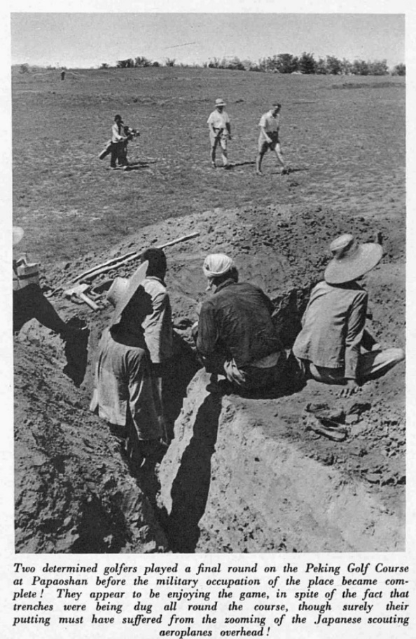 照片说明:“在军事占领之前,两位坚持不懈的球手在北跑马场高尔夫球场打最后一轮!看起来两人十分投入,即便球场正在到处挖防空掩体,但在日本飞机低空盘旋之时,肯定会影响他们在果岭上的推击!”
