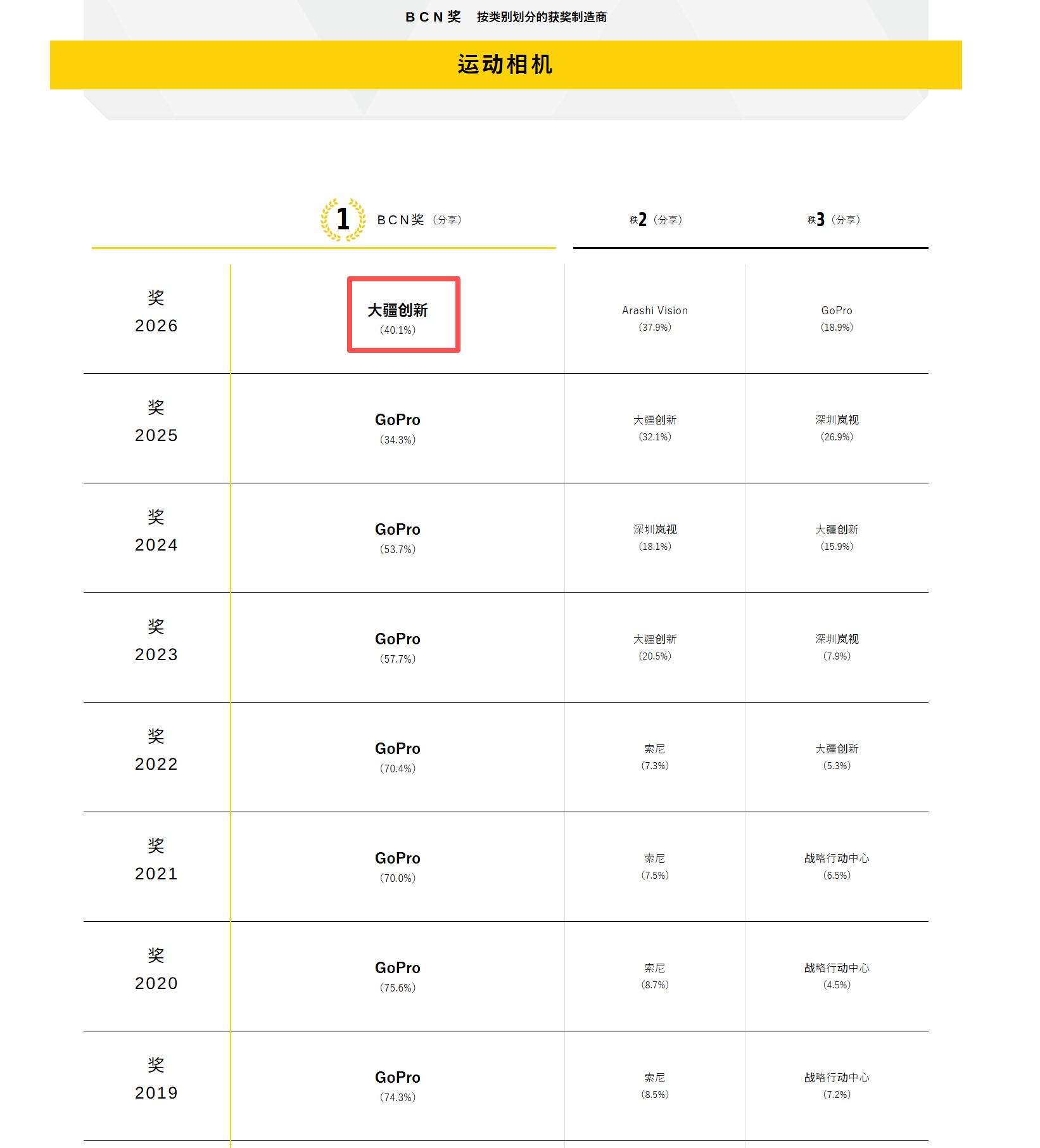 【环球网低空经济频道综合报道】不止是无人机,大疆的运动相机在日本市场也成为TOP1。日本权威零售分析机构BCN+R于2026年1月19日正式向大疆颁发“BCN AWARD 2026”两大年度奖项,大疆一举包揽“数码摄像机”与“运动相机”两大品类年度销量冠军。其中,在竞争激烈的运动相机领域,大疆凭借Osmo Action系列、Osmo 360全景相机以及Osmo Nano穿戴相机等产品的卓越表现,首次夺得该品类年度销量第一,打破GoPro在日本市场的十年销量垄断地位,标志着大疆在运动影像领域已建立起全面的市场领先优势。