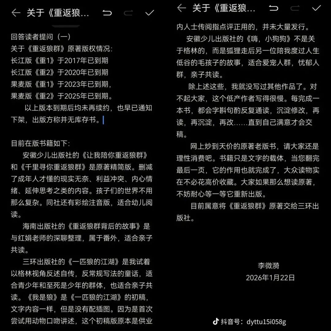 她向读者明确了《重返狼群》原著的版权情况,以及目前再版书籍的相应信息。