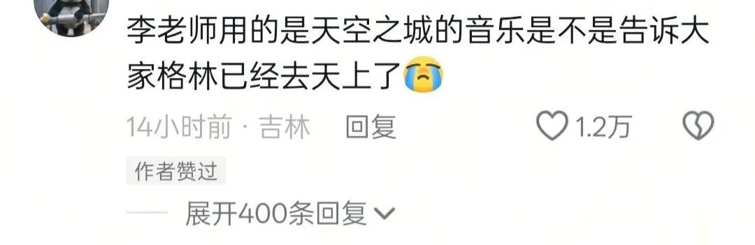 对于大家最为关心的格林的近况,李微漪一直没有做出直接的回应。评论区中有读者关注到图文背景音乐是《天空之城》,由此猜测格林是否“已经去了天上”,李微漪点赞了这条评论。