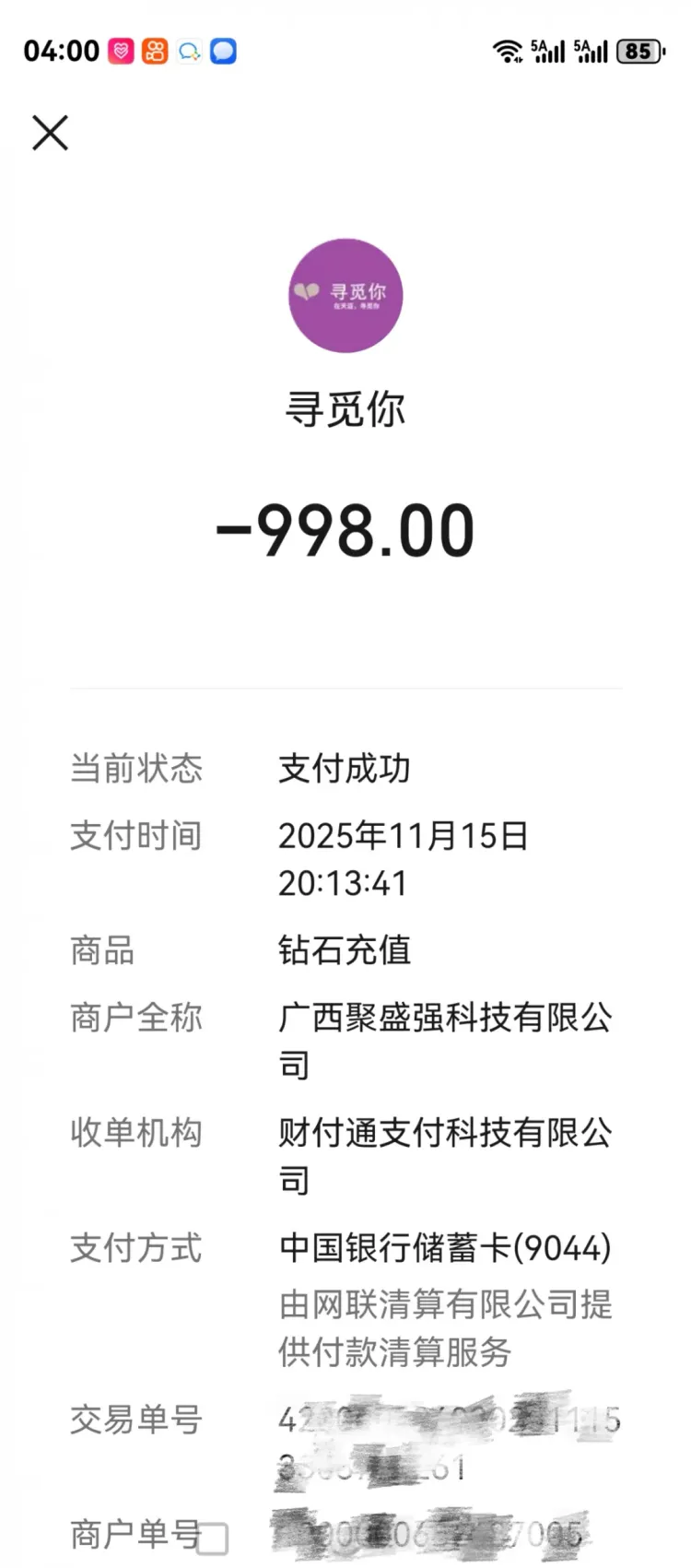 ▲“寻觅你”支付页面的商户全称显示为广西聚盛强科技有限公司。