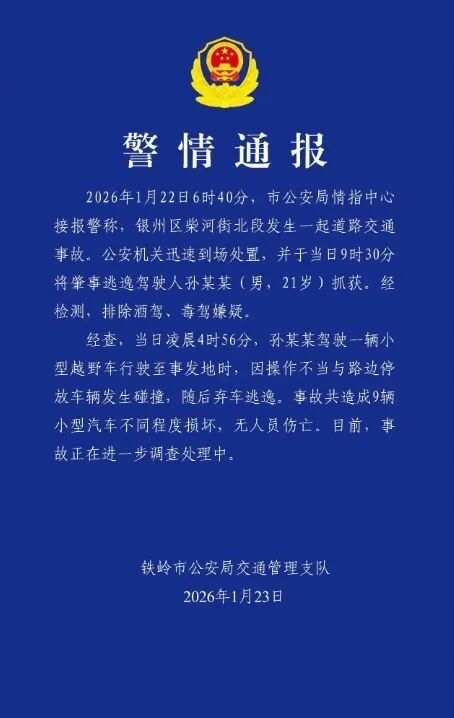 2026年1月22日6时40分,铁岭市公安局情指中心接报警称,银州区柴河街北段发生一起道路交通事故。公安机关迅速到场处置,并于当日9时30分将肇事逃逸驾驶人孙某某(男,21岁)抓获。经检测,排除酒驾、毒驾嫌疑。