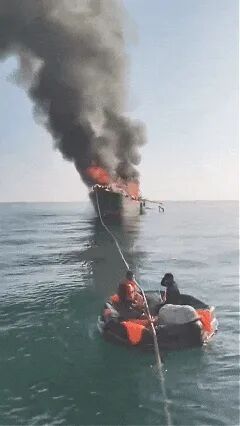 时间紧迫,唐孟雄和同伴立即绕船寻找。就在快艇刚靠近船尾时,渔船突然发生二次爆炸,火焰和浓烟瞬间翻涌,现场惊险万分。唐孟雄和同伴不断大声呼喊,提醒被困船员立即跳船逃生。船员听到喊声跳入海中,并被迅速拉上快艇,成功脱离险境。就在此时,渔船发生第三次爆炸。