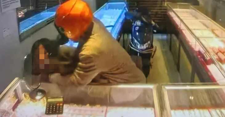 据悉,事发时间为18日。监控画面显示,店面卷帘门正在关闭时,戴头盔的嫌疑人从门缝钻入,殴打、电击店主,砸坏货品柜取走财物。