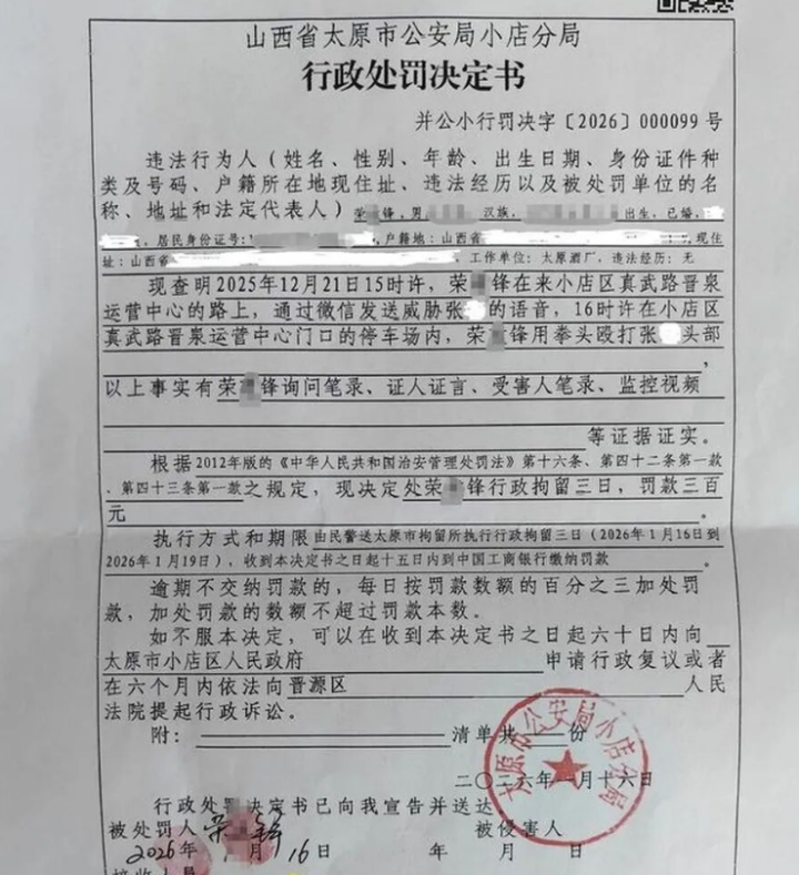 根据太原市公安局小店分局对荣某锋作出的行政处罚决定书:2025年12月21日15时许,荣某锋在来小店区真武路晋泉运营中心的路上,通过微信发送威胁张先生的语音,16时许在小店区真武路晋泉运营中心门口的停车场内,荣某锋用拳头殴打张先生头部。根据《中华人民共和国治安管理处罚法》相关规定,现决定处荣某锋行政拘留3日,罚款300元。