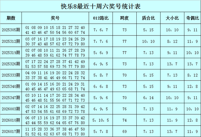 福彩快乐8第2026017期(上周六)开奖回顾:11 15 28 33 36 37 38 46 47 50 51 52 61 62 63 67 68 71 73 80,其中奖号012路比为5:7:8,跨度为69,质合比为7:13,大小比为13:7,奇偶比为11:9。
