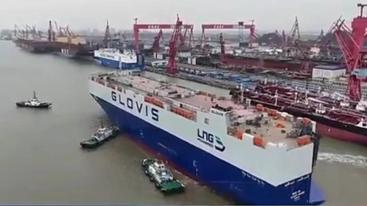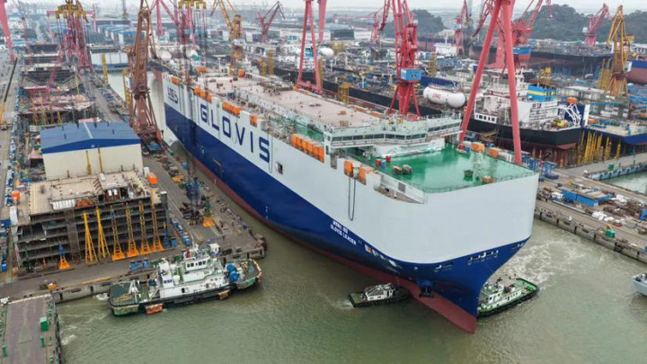 第一,中国船舶工业从“追随者”变成了“领跑者”。以前全球大型汽车运输船市场被韩国、日本垄断,咱们只能造中小型的。现在不一样了,2025年1月全球所有汽车运输船新订单都被中国船企拿下,中国船舶集团一家就占了近50%的份额。