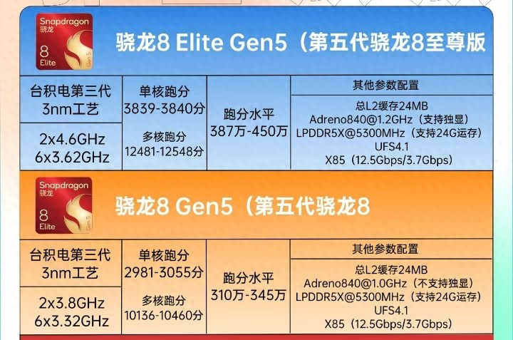 1:在智能手机芯片领域,高通骁龙系列始终占据着举足轻重的地位,每一次迭代都引领着移动计算性能的新风向。骁龙8 Elite Gen5与骁龙8 Gen5两款芯片,作为第五代骁龙8系列的代表作,引发了业界广泛关注。它们均采用台积电第三代3nm工艺制程,标志着移动芯片制造工艺迈入更精密、更高效的全新阶段。这一工艺进步不仅带来性能的跃升,更在能效控制上实现突破,为旗舰手机的续航与散热表现提供坚实支撑。