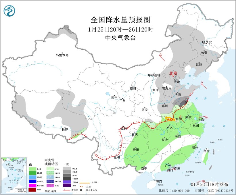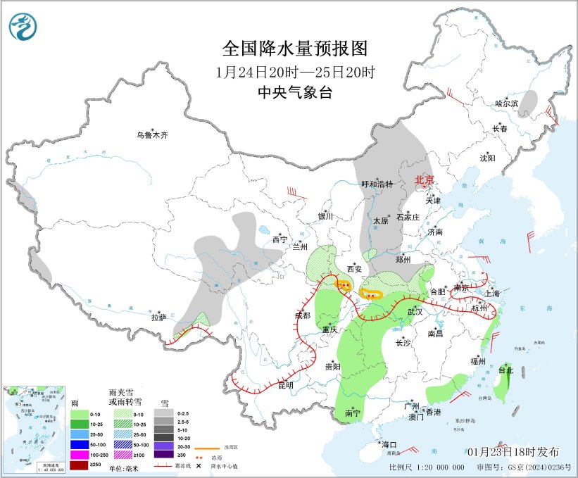 图1 全国降水量预报图(1月23日20时-24日20时)