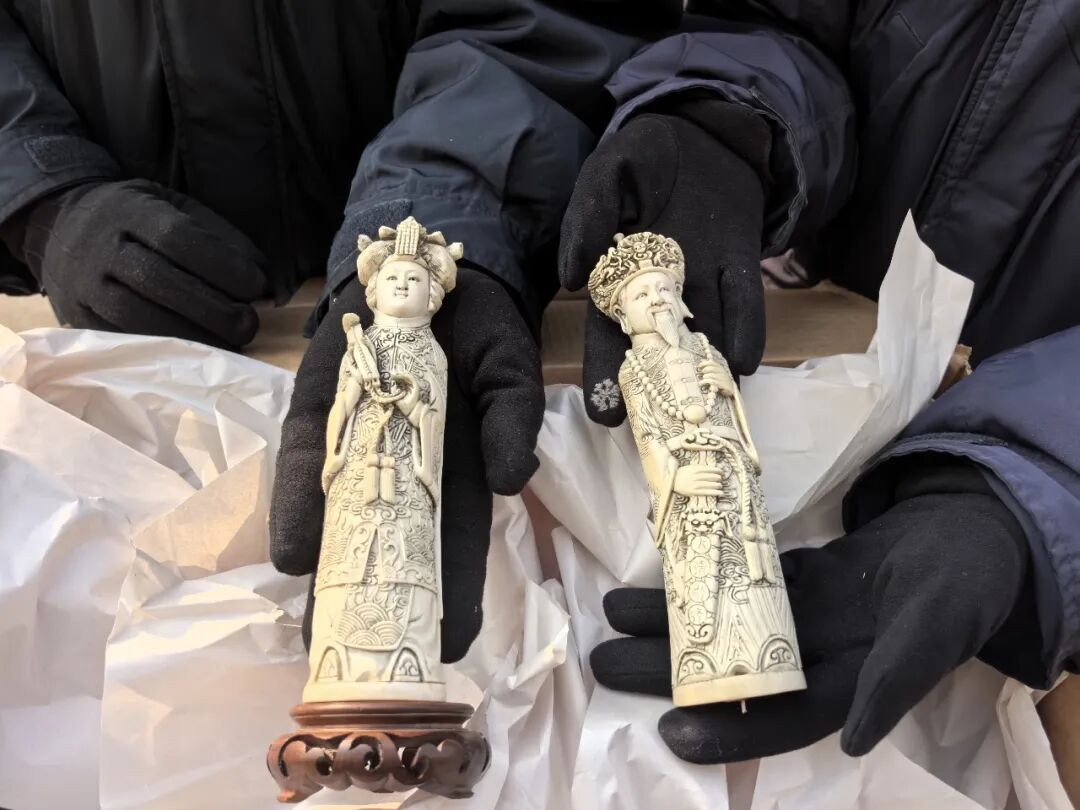现场关员在对申报为“装饰品”的行李物品实施查验时,发现疑似象牙制品的人物摆件两件,其主体呈乳白色,且具有明显的十字交叉纹路,符合象牙制品特征。经天津海关动植物与食品检测中心鉴定,米兰两件摆件均为现生象象牙制品,非文物,共重568克。