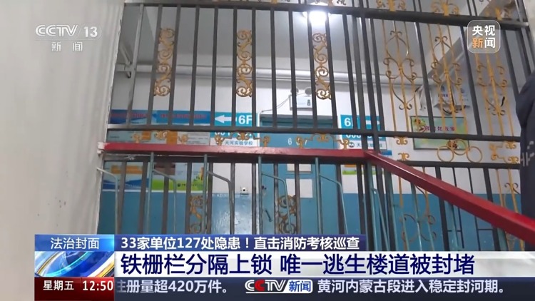 在河北邯郸这间学校的四层集体宿舍楼,考核组看到每层疏散走道中间,均设置了铁门分隔,且实行夜间上锁,导致整栋楼的男生和女生宿舍,仅有一部疏散楼梯可使用。