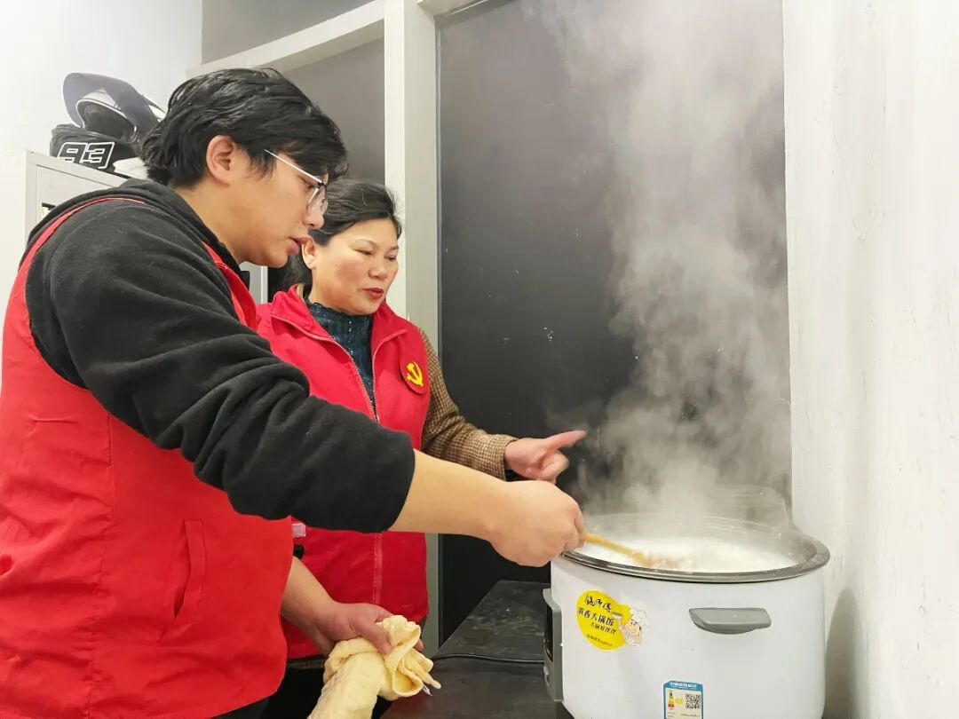 黄小琴指导儿子王胜凯如何熬粥。