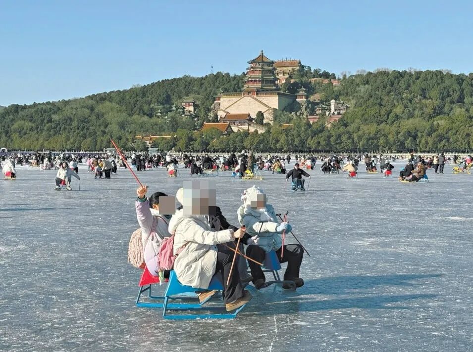 记者日前来到颐和园冰场,尽管是工作日,冰面上依然人流如织。孩子们滑着冰车穿梭嬉戏,年轻人则玩起冰车接龙。每辆冰车都配备两支冰杖,末端是一根长约3厘米的铁钎,不少游客挑选时还专挑尖锐的。
