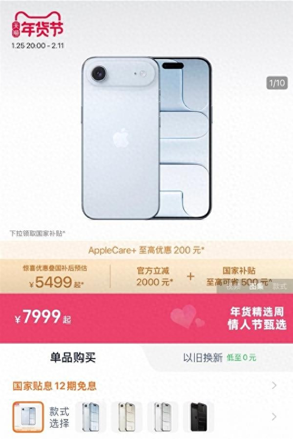 1月23日苹果天猫官方旗舰店开启新年优惠,iPhone Air原价7999元,官方立减2000元后还能叠加500元国补,最终到手价低至5499元起。这款去年10月才开售的新机,仅三个月就创下iPhone史上最快降价纪录。这波操作是临时清库存还是苹果定价策略的重大转向?
