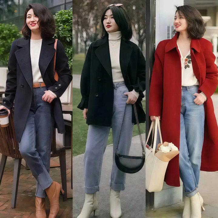 你挑牛仔裤的时候,别选那种洗得发白或者破洞一堆的款式,深蓝色、版型干净的基础款就挺好,既不会抢大衣的风头,又能稳稳地撑住整套搭配。