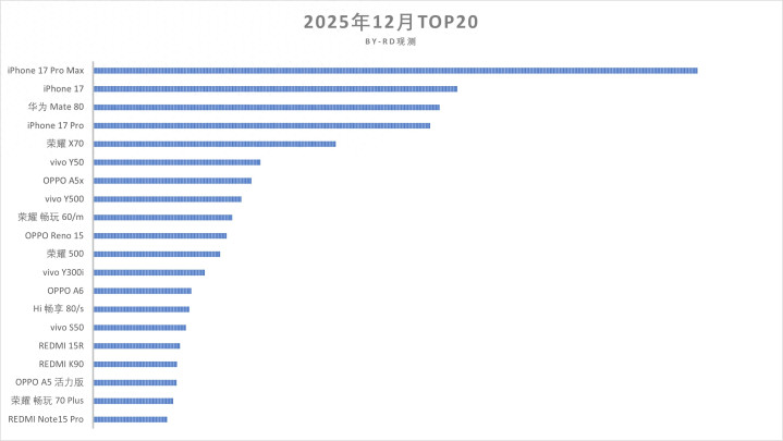 今天分享的是2025年12月份国内手机畅销榜:其中华为Mate80小胜iPhone17Pro,在畅销榜中排名第三,是12月份最畅销的国产手机。iPhone17排名第二,看来喜欢标准版的用户终于下手了,毕竟它是这两年最值得推荐的苹果手机。排名第一的是iPhone17Pro Max,它的官方售价为9999元起,在本月销量榜中继续遥遥领先。