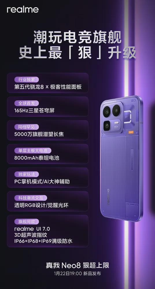 现阶段,真我Neo8在2026年1月22日晚上7点的时候正式发布,还同步开售,截至发文日(1月23日),已全面开售。