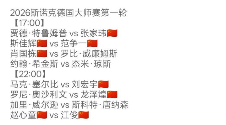 1月27日斯诺克德国大师赛首轮比赛正赛打响,本届德国大师赛原计划中国军团15人参赛,由于签证问题吴宜泽和常冰玉退赛,今日中国军团8人出战,其中两场中国德比比赛,赵心童PK江俊,斯佳辉PK范争一。